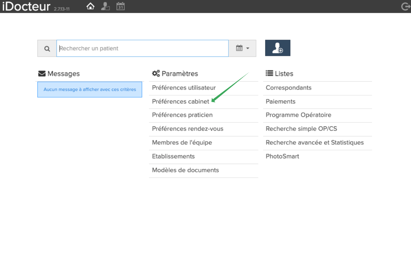 1 - Depuis la page d'accueil, cliquer sur "Préférences cabinet":